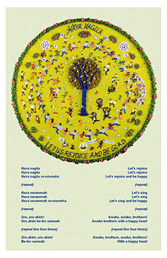 Centered in the image is the Tree of Life and doves. Circled around is everyone dancing the Hora. The klezmer band, the food table, and elder people clapping and holding the Israeli flags are a part of the joyous festivities.