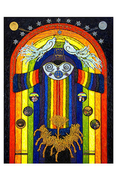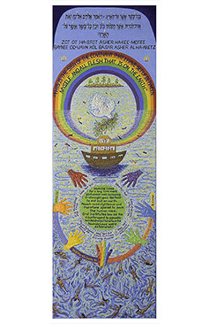 Deeper still is each color of the rainbow is brought forth throughout the painting including the fish representing the laws. If one follows all the commandments they will not perish. Approved by Rabbi Weg.
