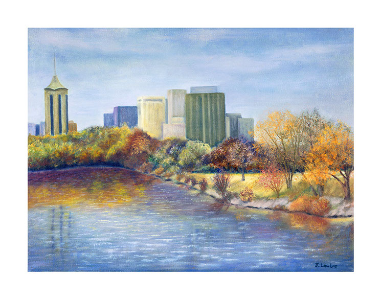 Cool blue water captures the reflection of a historic downtown Tulsa along Riverside Drive on a crisp autumn day.