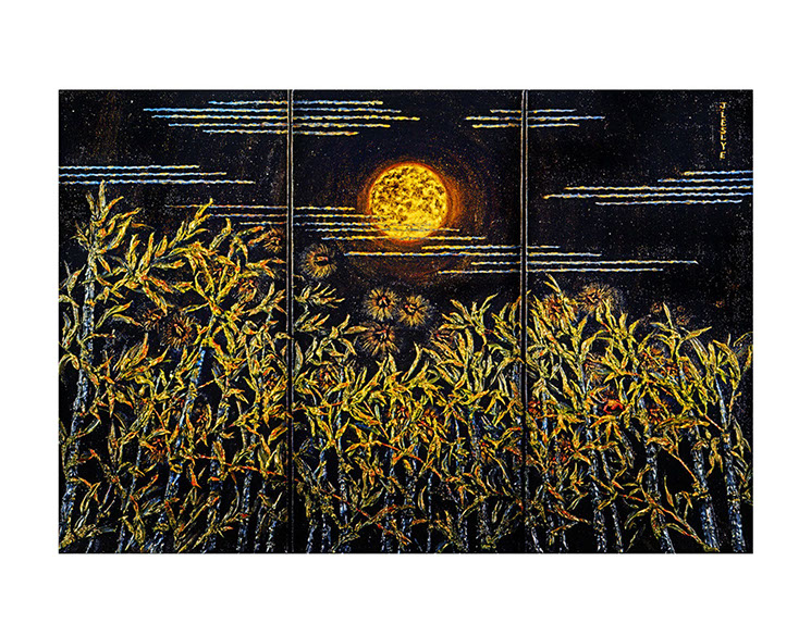 Originally painted on three panels. Inspiration came to me because bamboo grows along the river. An odd number of fireflies. And gentle clouds with river lines. Who’s looking at the moon? Is it the fireflies, the cricket, or you the viewer?