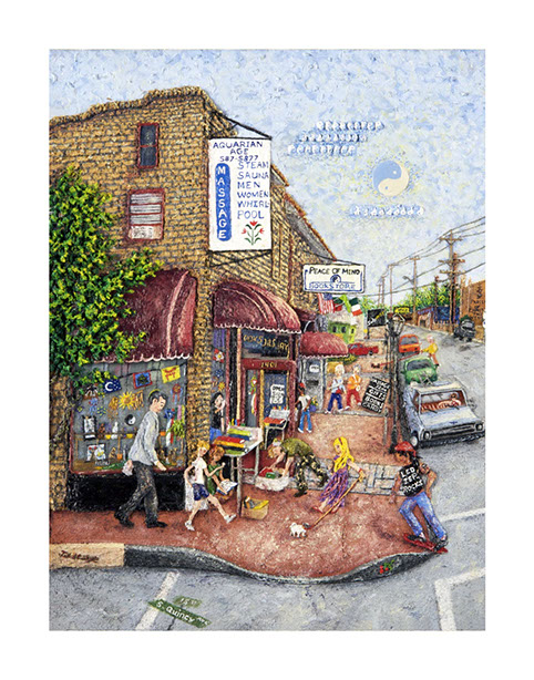 The scene depicts actual people including the owner that worked at the stores or frequented the bookstore for spiritual enlightenment.